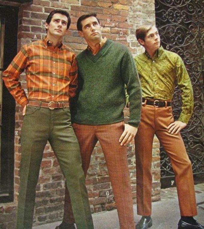 К примеру, фабрика Комсомольска-на-Амуре производила коричневые и розовые костюмы из тонкого материала, ничего общего не имеющего с настоящей "джинсой". Справедливости ради стоит заметить, что в начале рассматриваемого нами десятилетия джинсы носили немногие, а более популярными были "клеши" — узкие брюки, расширяющиеся от колен. Потом стали носить брюки, штанины которых расширялись от бедра. Считалось идеальным, когда они полностью закрывали обувь.