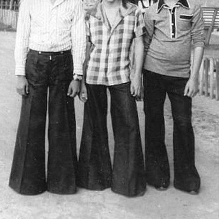 Вместе с семидесятыми годами вошли в моду джинсы. В Советском Союзе они появились в 1957 году, но популярными стали несколько позже. Наша промышленность отреагировала на спрос и стала выпускать так называемые джинсовые костюмы нелепых цветов.