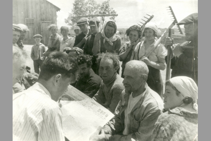 Коллективное чтение материалов о Сталинской Конституции в обеденный перерыв на полях. 1937 г.. Фото: Фото: Фонд Этнографического музея