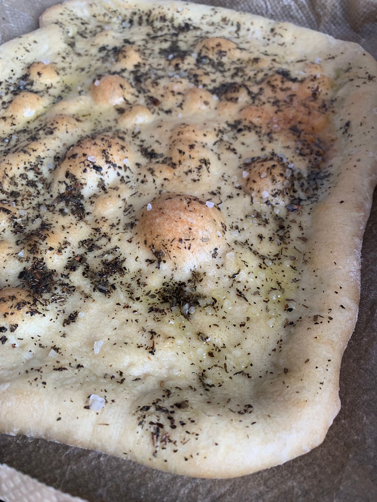 Фокаччу можно просто смазать оливковым маслом, посыпать итальянскими травами и крупной морской солью, как в нашем варианте, а можно добавить любую начинку на ваш вкус! Помидоры, сладкий и острый перцы, оливки, лук, ветчину, сыр и тд.
