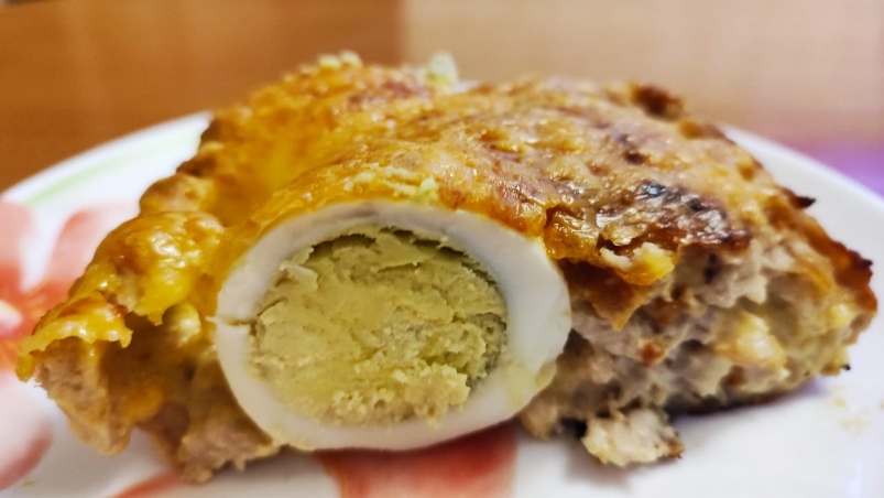 Затем ровно выкладываем на середину нашего фарша мягкий сыр, а на него друг за другом — яйца.