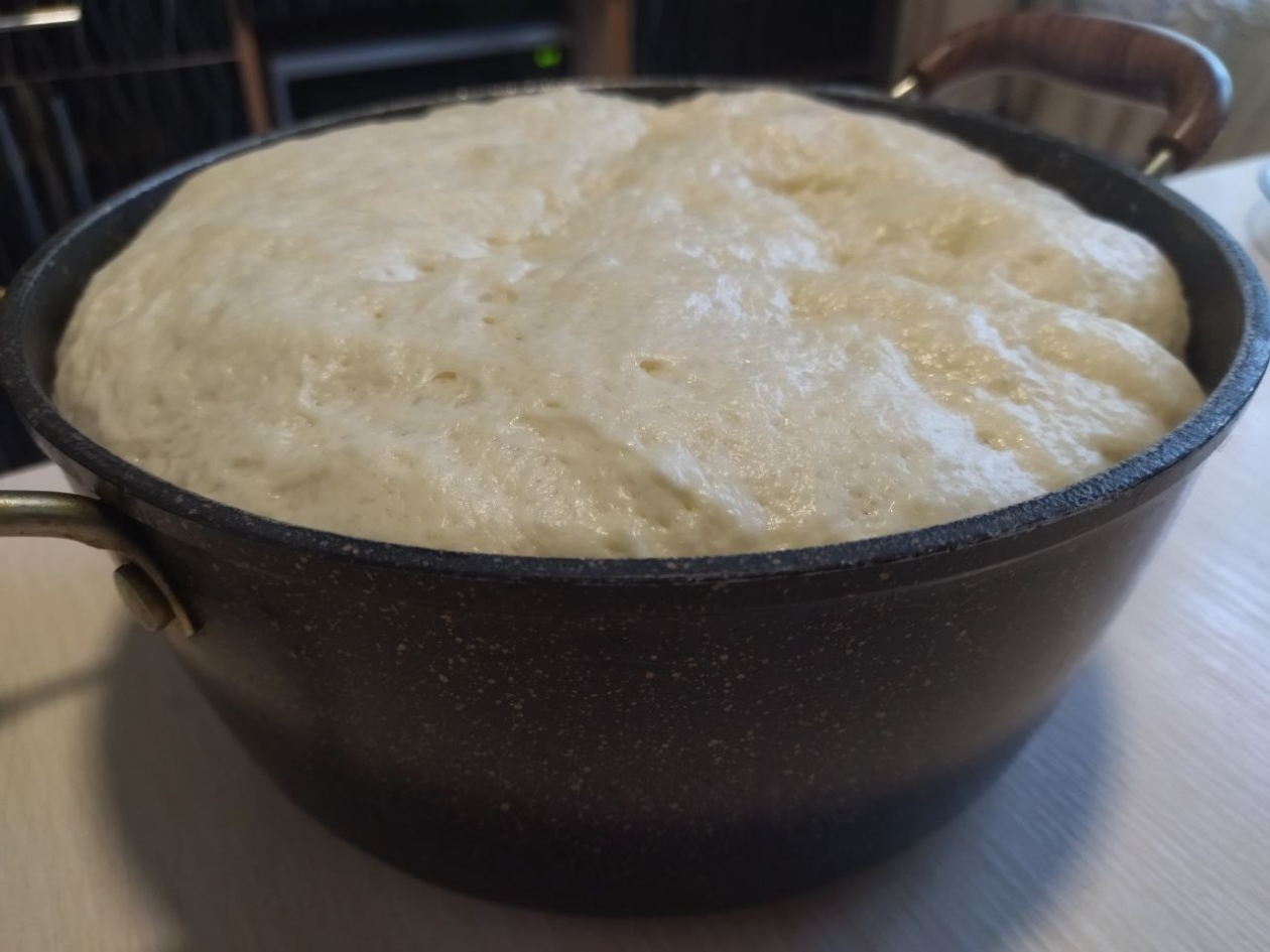Поставим тесто в теплое место, чтобы оно поднялось. Подниматься оно будет в 3 этапа в течение 1,5 часов. Каждые полчаса тесту нужно оседать, для этого просто приминайте его рукой и давайте вновь подняться, а через полчаса вновь примните его и так 3 раза.