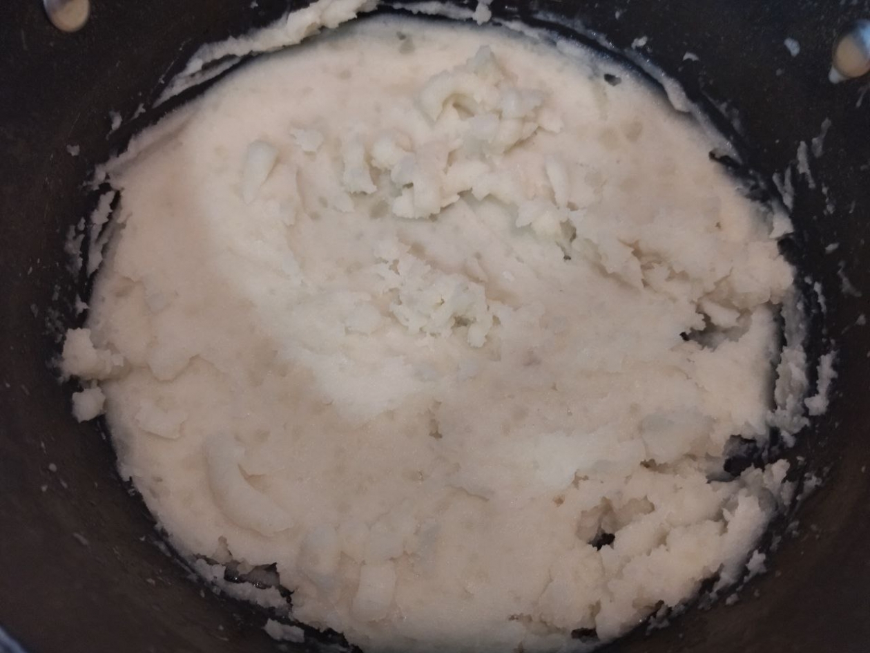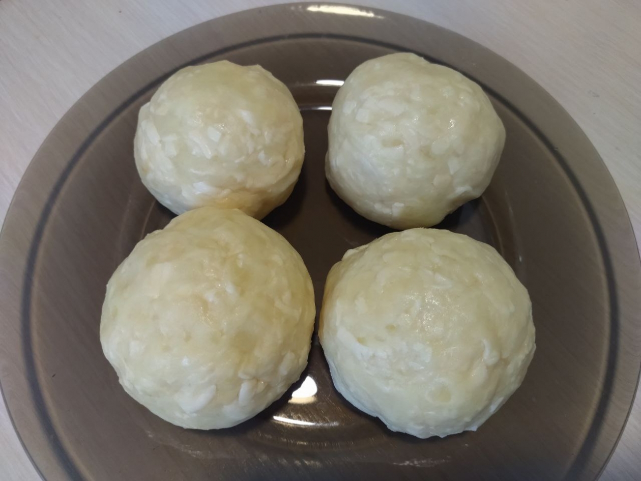 Пока тесто поднимается, займемся начинкой. Картофель отварить без соли. Потолочь толкушкой в пюре с добавлением сливочного масла. Сыр (любой, какой вы любите) потереть на терке, смешать его толчёной картошкой. Разделить массу на четыре равные части и скатать шарики.