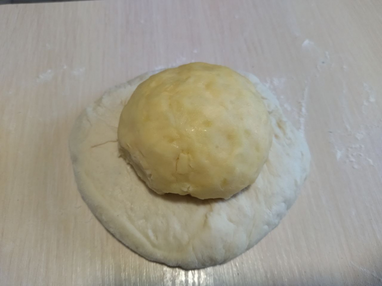 Посыпаем рабочую поверхность мукой, немного, чтобы тесто не прилипало. Готовое тесто делим на четыре части. Берем первую часть и разминаем ее в небольшую лепешку. На центр лепешки кладем шарик из начинки и упаковываем его в тесто, как в мешочек. Хорошенько запечатываем край. Переворачиваем наш "мешочек" заклеенным краем вниз и начинаем его прессовать от центра к краю, сдвигая начинку к краям образующейся лепёшки, до тех пор, пока она (лепёшка) не станет толщиной 1-1,5 см.