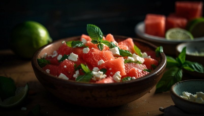 Дольки арбуза очистите от кожуры и семечек, порежьте небольшими кусочками. Брынзу порезать небольшими кубиками.