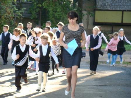 Ребята выходили из "горящей" школы под руководством учителей согласно плану эвакуации. Нормативом предусмотрено покидание школы за пять минут.