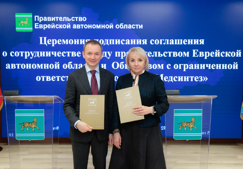 EAOMedia, 12 ноября. Глава ЕАО Мария Костюк и председатель совета директоров "ООО "Завод Медсинтез", председатель наблюдательного совета НП "Уральский биомедицинский кластер" Александр Петров подписали два стратегических соглашения о сотрудничестве. Об этом губернатор области сообщила в своем тг-канале (18+).
