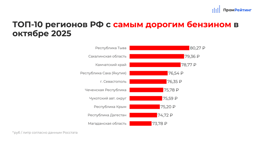 Согласно данным официальной статистики, индекс потребительских цен на бензин в октябре составил 102,6%, в сравнении с аналогичным периодом прошлого года — 115,0%. Рост цен на бензин на 2,6% и более произошел в 33 регионах.