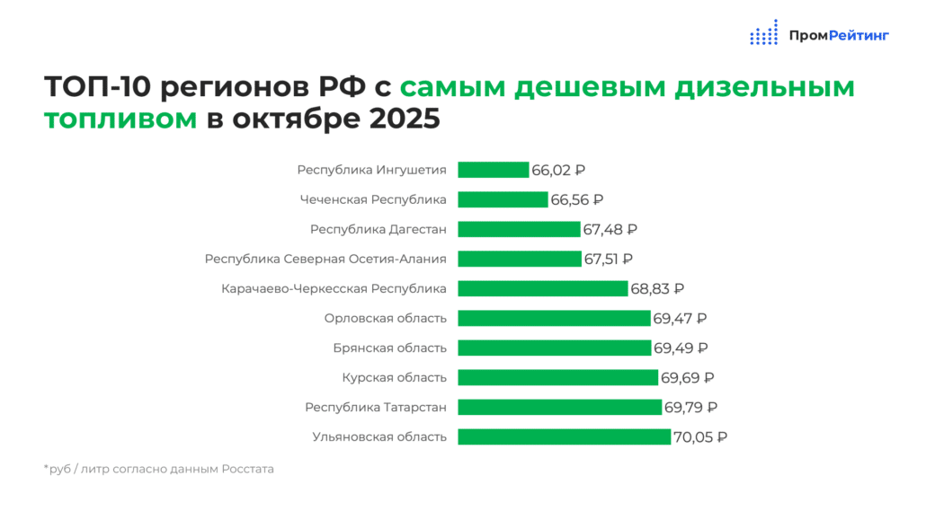 EAOMedia, 1 декабря. Еврейская автономная область по итогам октября 2025 года осталась в десятке регионов с самым дорогим дизельным топливом. Его стоимость, по данным Росстата, составила 79,93 рубля за литр (78,37 рубля месяцем ранее) . Это отправило ЕАО на восьмую строку в федеральном рейтинге, составленном аналитическим агентством "ПромРейтинг".