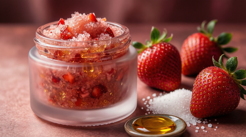 Возьмите спелую клубнику, разомните вилкой до пюре. Добавьте немного сахара для мягкого скрабирования, и каплю масла жожоба — для глубокого увлажнения и питания.