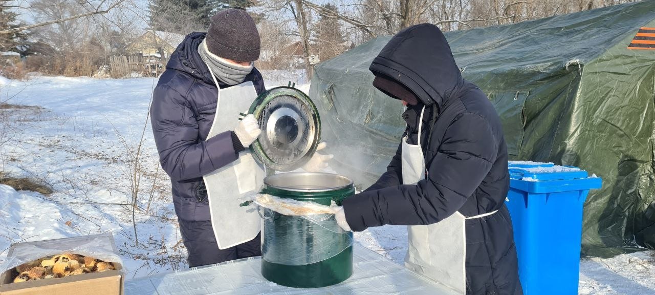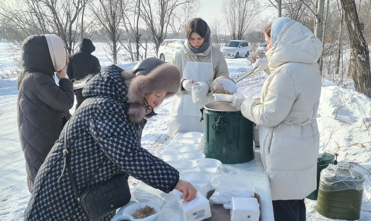 На заливе оборудовали купель, установили палатки, где биробиджанцы могут переодеться и согреться. Здесь же работает полевая кухня. Ожидается, что Крещенский городок посетят многие биробиджанцы.