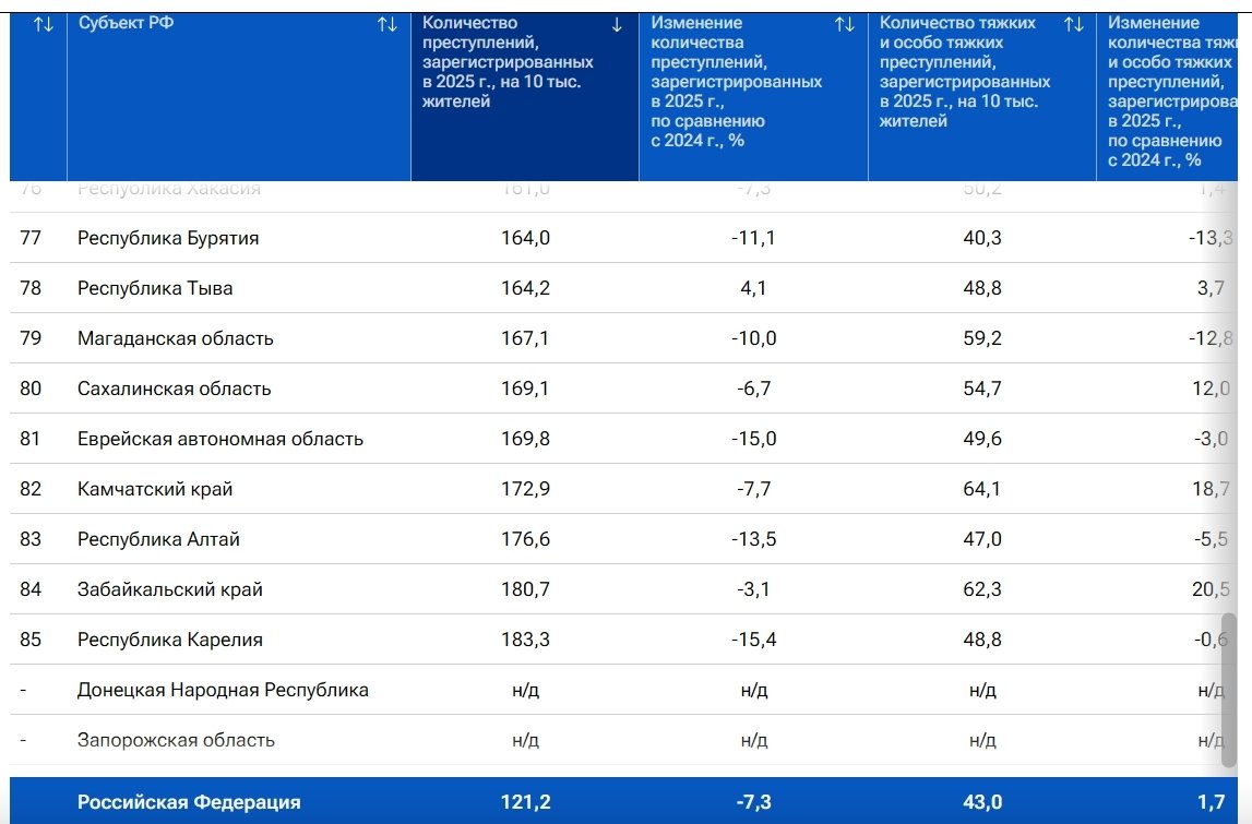 Самый высокий уровень преступности, как и в прошлом году отмечен в Карелии, где было зарегистрировано 183 преступления на 10 тысяч жителей. В замыкающей тройке также Забайкальский край и Республика Алтай, где в 2025 году было зарегистрировано 181 и 177 преступлений на 10 тысяч жителей соответственно. При этом эксперты отмечают, что во всех этих трех регионах число преступлений снизилось по сравнению с предыдущим годом.