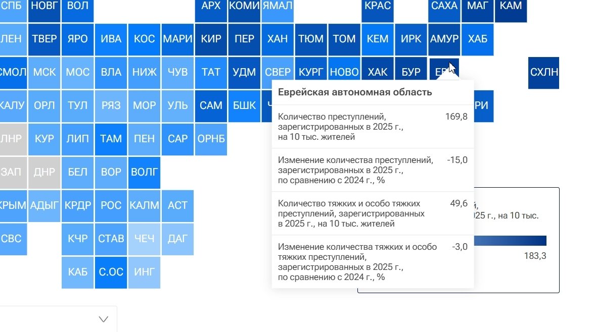 Общее количество преступлений, зарегистрированных в ЕАО за 2025 год, составило 169,8 на 10 тысяч жителей, что на 15% меньше, чем годом ранее. Тяжких и особо тяжких преступлений насчитали 49,6 на 10 тысяч жителей (-3%).Как отметили авторы исследования, рейтинг регионов составлен на основе данных МВД и Росстата.