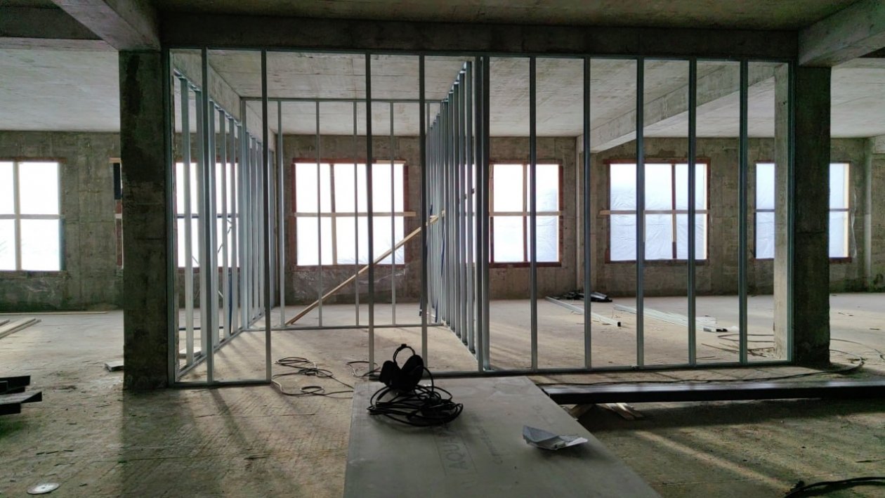 Сейчас на объекте идёт формирование теплового контура — монтируется система теплоснабжения, устанавливаются утеплённые окна и двери. Параллельно обустраиваются лестничные марши, возводятся перегородки в подвале и на первом этаже.