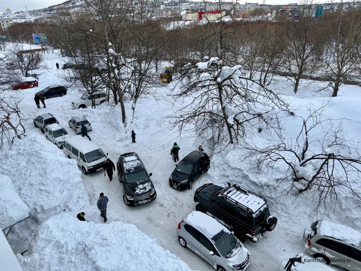 Обычный двор в Петропавловске-Камчатском. Последний раз снег убирали в середине декабря. После всех циклонов проезд полностью заблокирован уже две недели. Невозможно вывезти мусор, проехать пожарным и скорой, подвести товары в окрестные магазины. Попытка погрузчика пробиться в соседний двор закончилась крахом — спецтехника чуть не свалилась в яму со свежеоткопанным автомобилем, а потом превратила въезд в площадку для могула с трамплинами и ухабами.
