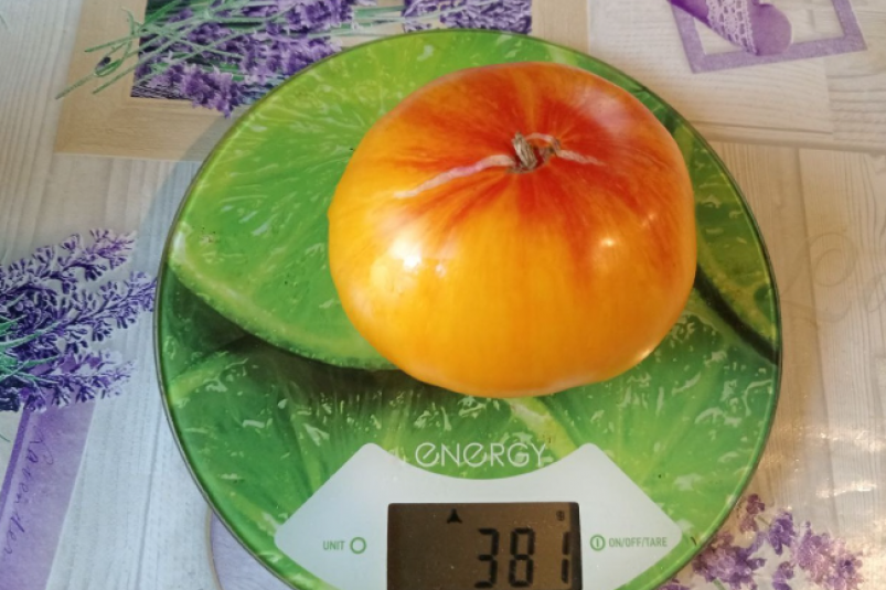 Особенность сорта — необычная окраска. Снаружи помидоры имеют оранжево-золотистый оттенок с розовыми штрихами, а внутри мякоть ярко-оранжевая с контрастными полосками. Благодаря этому томаты выглядят эффектно в свежих салатах.