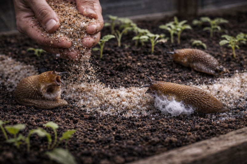 Смешайте соль и крупный песок в пропорции 1:3. Это оптимальное соотношение, чтобы соль хорошо распределялась, а песок создавал нужную текстуру. Посыпьте смесь вокруг растений или вдоль дорожек, по которым часто ползают слизни. Этот барьер не только защитит рассаду, но и сделает участок менее привлекательным для вредителей.