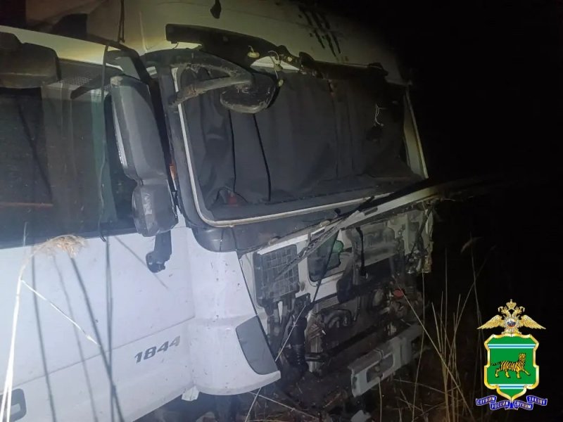 "По предварительным данным, 15 апреля 2026 года в 21.30 в районе 1965 км 300 м на ФАД "Чита — Хабаровск", Смидовичский район, водитель автомобиля "Мерседес Актрос" с полуприцепом "Гранвалд" совершил съезд в левый придорожный кювет с последующим опрокидыванием полуприцепа. В результате ДТП транспортное средство и полуприцеп получили механические повреждения", — говорится в сообщении.