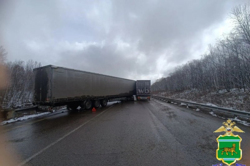 По предварительным данным, 23.04.2026 в 05.30 на ФАД "Чита-Хабаровск" в Облученском районе водитель автомобиля "ФАВ" с полуприцепом не учел состояние дорожного покрытия, не справился с рулевым управлением и совершил наезд на стоящий автомобиль "Валдай" с полуприцепом. В результате ДТП автомобили получили механические повреждения.