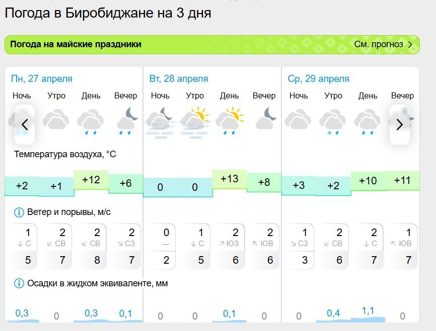 ИА ЕАОMedia предлагает читателям ознакомиться с прогнозом погоды на начало новой недели в ЕАО, подготовленным на основании данных Гисметео.