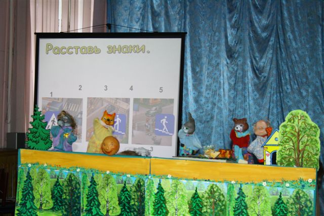 Действие спектакля то и дело перетекало из-за кукольной ширмы в зал, и зрители становились участниками сценок и викторин, отгадывая вопросы ведущей по правилам дорожного движения. К примеру, нужно было рассказать, что обозначает тот или иной дорожный знак, и даже расставить знаки вокруг родной школы, для чего был создан весьма похожий на альма-матер макет.