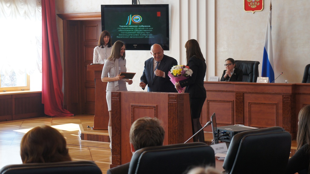Общественную молодежную палату поздравили лидеры партийных фракций в областном парламенте. Члены Общественной молодежной палаты I-IV созывов Марина Линштейн и Андрей Голубь, член ОМП I-II Мария Ковтун поблагодарили за создание палаты председателя Законодательного Собрания ЕАО Анатолия Тихомирова.