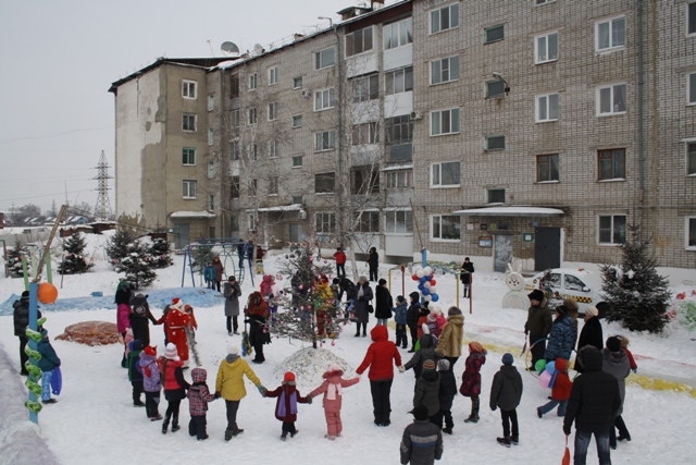 Каждый ребенок, вышедший в этот час во двор и принявший участие в общем празднике, получил сладкий подарок. Дети водили хоровод вокруг елки, бросали снежки на точность, бегали наперегонки в эстафетах.