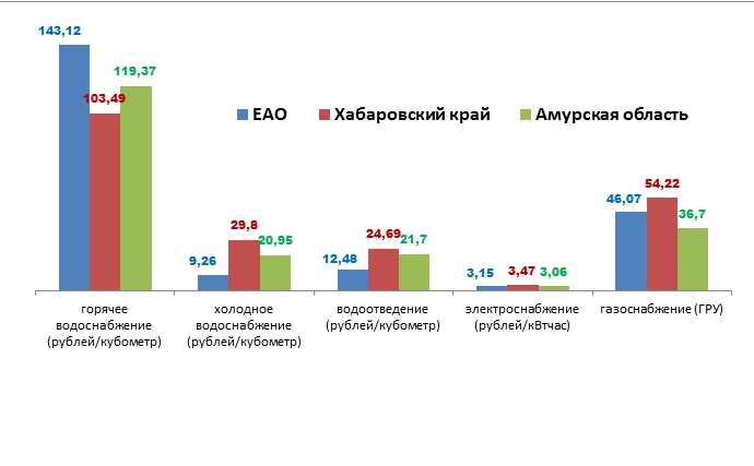 В ходе пресс-конференции председатель комитета Галина Шлыкова привела сравнительные данные о действующих тарифах в областном центре и Хабаровске. При явно меньших показателях оплаты расходов по водоснабжению – 9,26 рубля против 29,8 рубля за кубометр, водоотведению (12,48 рубля против 24,69 рубля за кубометр), бытовому газу (46,07 рубля против 54,22 рубля за один кг при пользовании газом через газораспределительные установки) и меньшим тарифом по оплате электроэнергии (3,15 рубля за кВт/час в Биробиджане и 3,47 рубля за кВт/час в Хабаровске) общая сумма расходов примерно равна.