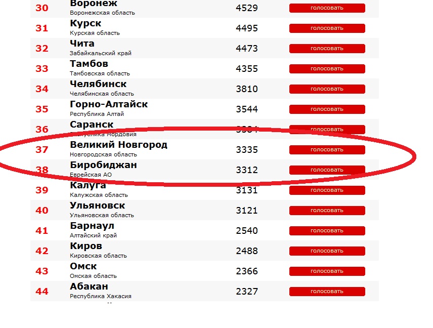 Количество поданных голосов за Великий Новгород (37 место в рейтинге) выросло с 2819-ти до 3335-ти, в то время как у Биробиджана (38 место в рейтинге) число сторонников увеличилось на 183 человека.