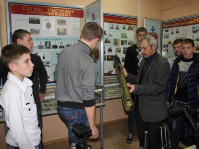 Встреча ветеранов ОВД и учащихся технического техникума прошла в музее Славы УМВД. Принимал гостей, многие из которых состоят на учете в подразделении по делам несовершеннолетних, председатель совета ветеранов МО МВД "Биробиджанский" Виктор Ицкевич. В нынешнем году шефство над ребятами из технического техникума (бывшего училища № 3) взяли сотрудники патрульно-постовой службы, сообщила корр. ИА ЕАОmedia руководитель пресс-службы УМВД РФ по ЕАО Оксана Ткачёва.