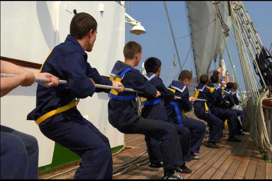 В ходе плавательной практики ребята набирают необходимый плавательный ценз, вписываются в судовую жизнь, изучают парусное дело и отрабатывают все тонкости морского дела. В ходе рейсов ребята продолжают учиться, сдают зачеты, экзамены, несут ходовые и стояночные вахты каждый по своей специальности: судомеханики, электромеханики – в машинном отделении, судоводители – практикуются на ходовом мостике, а радисты – в радиорубке. И, конечно же, все ребята проходят рабочую смену на палубе. По итогам плавательной практики каждый студент сдает экзамен, тянет билет, отвечает на все вопросы и на деле демонстрирует приобретенные знания и навыки, будь то в машинном отделении или на судовом мостике, или в радиорубке. Много премудростей постигают ребята за полтора месяца плавания.