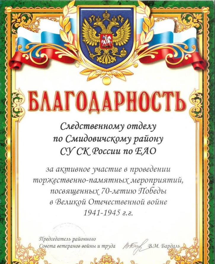 Сотрудники следственного отдела по Смидовичскому району Еврейской автономной области получили благодарность Совета ветеранов за активное участие в мероприятиях, приуроченных к юбилею Победы. Кроме того, председатель организации Валентина Бардаль поблагодарила коллектив за чуткое и внимательное отношение к ветеранам, сообщила ИА ЕАОMedia старший помощник руководителя СУ СК России по ЕАО Наталья Добробабина.