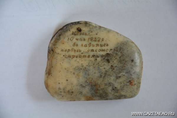 "Дверь открыла дочь - Татьяна. После недолгого разговора выяснилось, что артефакт нашел ее сын действительно на огороде Галины Николаевны. Татьяна почти сразу согласилась показать нам находку. На некоторое время у нас в руках оказался легкий предмет, внешне похожий на камень. Но подержав его в руках, действительно можно было предположить, что это или кость, или застывший гипс, или белый цемент. На "камушке" отчетливо видна надпись: "Здесь 10 мая 1932 года высадились первые комсомольцы - строители города"...