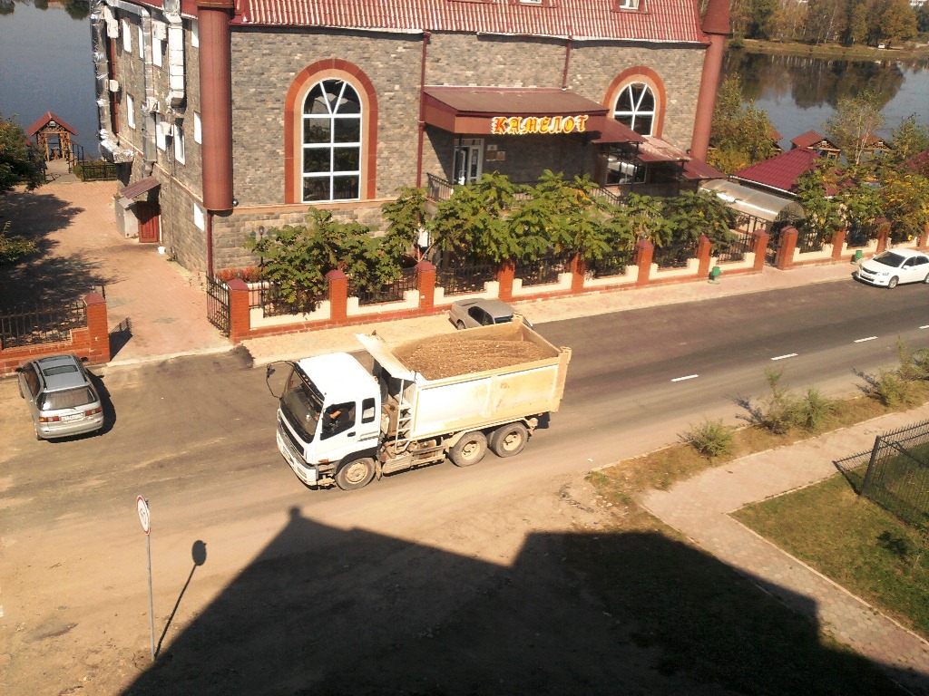 Большегрузы "убивают" свежий асфальт на Невской возле биробиджанского ресторана "Камелот"