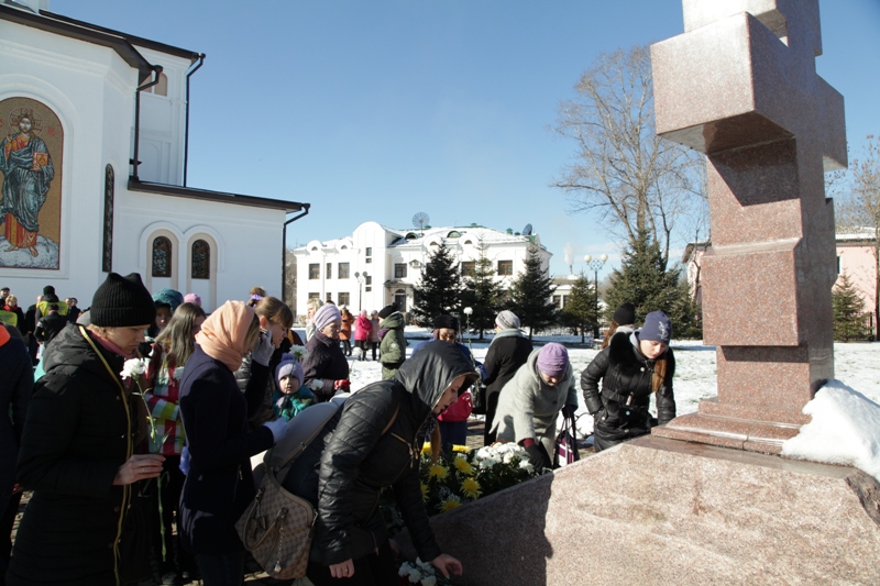 После завершения церковного обряда поминовения всех жертв сталинского террора прихожане вышли на территорию храма к поклонному кресту.
