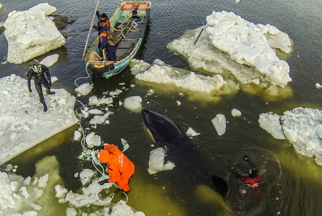 К этому времени поднялась волна. Освобожденное с помощью троса пространство быстро заполнилось глыбами льда. Стало понятно, что несмотря на все усилия, переместить косатку на более свободный участок воды у берега не удастся.