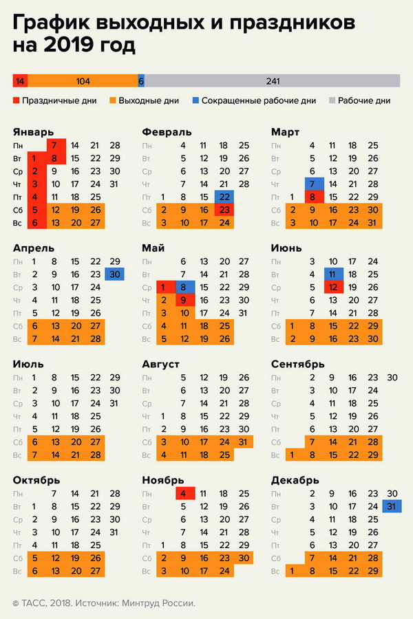 Придется крепко отдохнуть только в мае — выходные, связанные с Первомаем, продлятся пять дней с 1 по 5 мая. Затем последует трехдневная рабочая неделя, сменяющаяся четырехдневными выходными — с 9 по 12 мая.