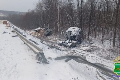 Снес ограждение, вылетел в кювет и перевернулся водитель большегруза на трассе в ЕАО