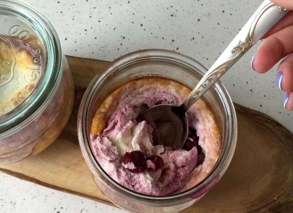 Яйца взбить в блендере с протеином, добавить 3 капли стевии. Вмешать творог и кефир до консистенции густой сметаны. Вишню выложить в форму, присыпать ванильным сахаром и залить творожной смесью. Важно, учесть, что во время выпекания запеканка увеличивается в объеме в 2 раза.