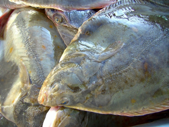 Рыбу разделывают на куски, смазывают маслом, сливками, обсыпают тертым сыром и жарят до готовности. Кладут рыбу на гренки. Растапливают сливочное масло, тушат лук, добавляют муку и жарят в течение нескольких минут, постепенно добавляют воду или бульон с томатом-пюре, кладут маслины и кипятят несколько минут. Приправляют и подают горячие куски рыбы с соусом.