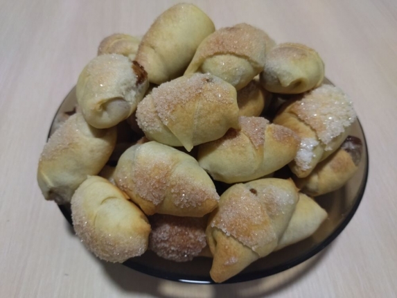 Противень смазать тонким слоем растительного масла, уложить рогалики на небольшом расстоянии друг от друга и отправить в духовку минут на 20 при температуре 200 градусов. Помните, что духовки у всех разные, поэтому наблюдайте. Как рогалики зарумянятся, значит готовы.