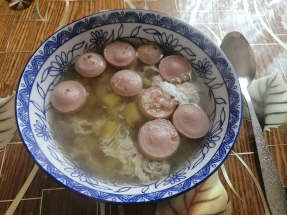 В подсоленную кипящую воду кладем картофель и гречку. Варим до готовности, минут 15-20. Добавляем сосиски, варим еще пару минут, и тонкой струйкой вливаем разболтанное яйцо, одновременно помешивая. Кипятим еще полминуты и выключаем газ. Суп готов!