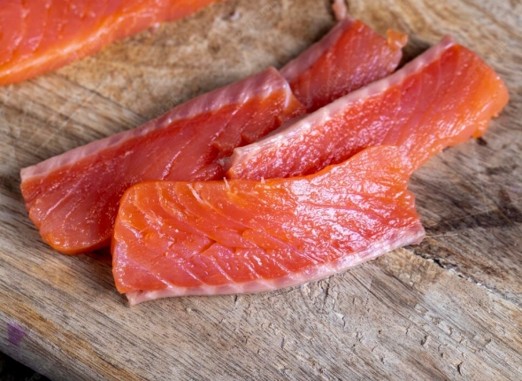 Отделяем голову и хвост — в процессе засолки эти части лишние. Голову можно потом использовать в приготовлении ухи. Чешуя не влияет на вкус, поэтому ее можно не чистить. Удаляем плавники острым кухонным ножом или большими ножницами. Потрошим кету, сделав разрез, идущий от головы к хвосту, и удаляем руками внутренности. Солить целой тушкой не очень удобно — просаливаться рыба будет намного дольше. Поэтому чаще кету засаливают разделанной на филе.