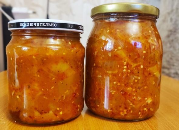 10. В горячие банки вливаем кипящее рагу и сразу же закатываем подготовленными крышками.