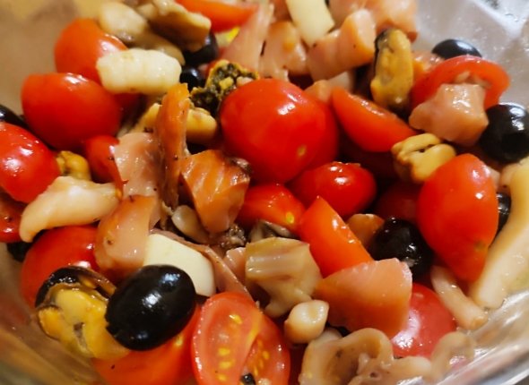 Мы предлагаем рецепт питательного, но в тоже время легкого салата с помидорами, маслинами, красной рыбой и морскими обитателями. Готовка не занимает много времени и составит 10-15 минут.