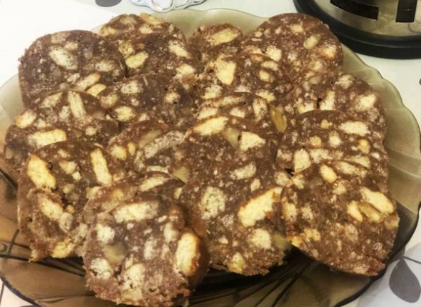 По истечении времени достаем нашу шоколадную колбасу, нарезаем и наслаждаемся вкусом детства!