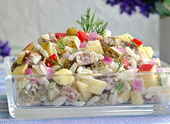 Приготовление: отвариваем рис , промываем его в холодной воде и остужаем до комнатной температуры. Говядину, огурец, нарезаем мелким кубиком. У яблока удаляем сердцевину и нарезаем его тоже мелким кубиком. Шинкуем репчатый лук и укроп.