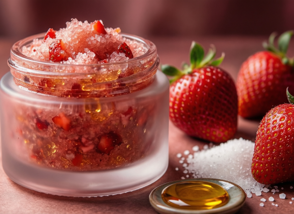 Возьмите спелую клубнику, разомните вилкой до пюре. Добавьте немного сахара для мягкого скрабирования, и каплю масла жожоба — для глубокого увлажнения и питания.
