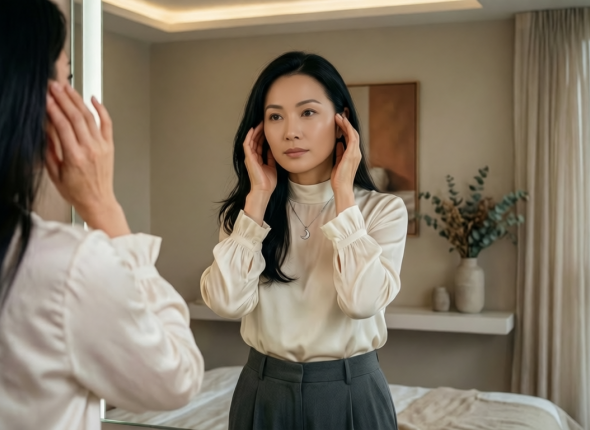 Попробуйте этот прием: кончиками указательных пальцев легко коснитесь внешних уголков глаз. Осторожно подтяните кожу чуть вверх и задержитесь буквально на 7 секунд — этого вполне достаточно. Дольше тянуть не стоит, чтобы не навредить тонкой возрастной коже.