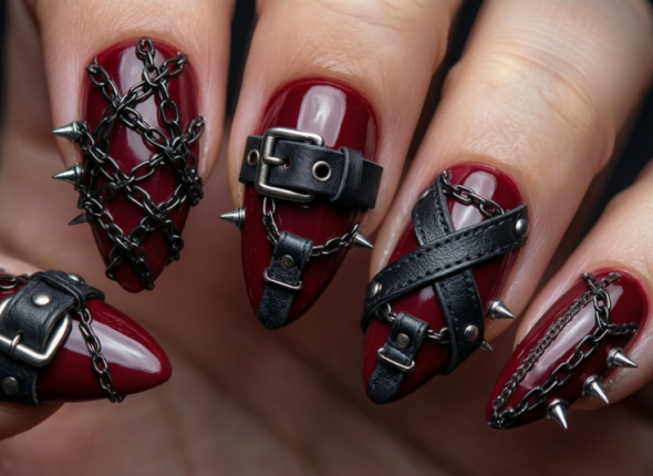 Идея в стиле "глэм-рок": сочный вишневый украсьте рисунками портупеи, цепочками или натуральными шипами. Такой маникюр точно намекнет, что вы та еще штучка.